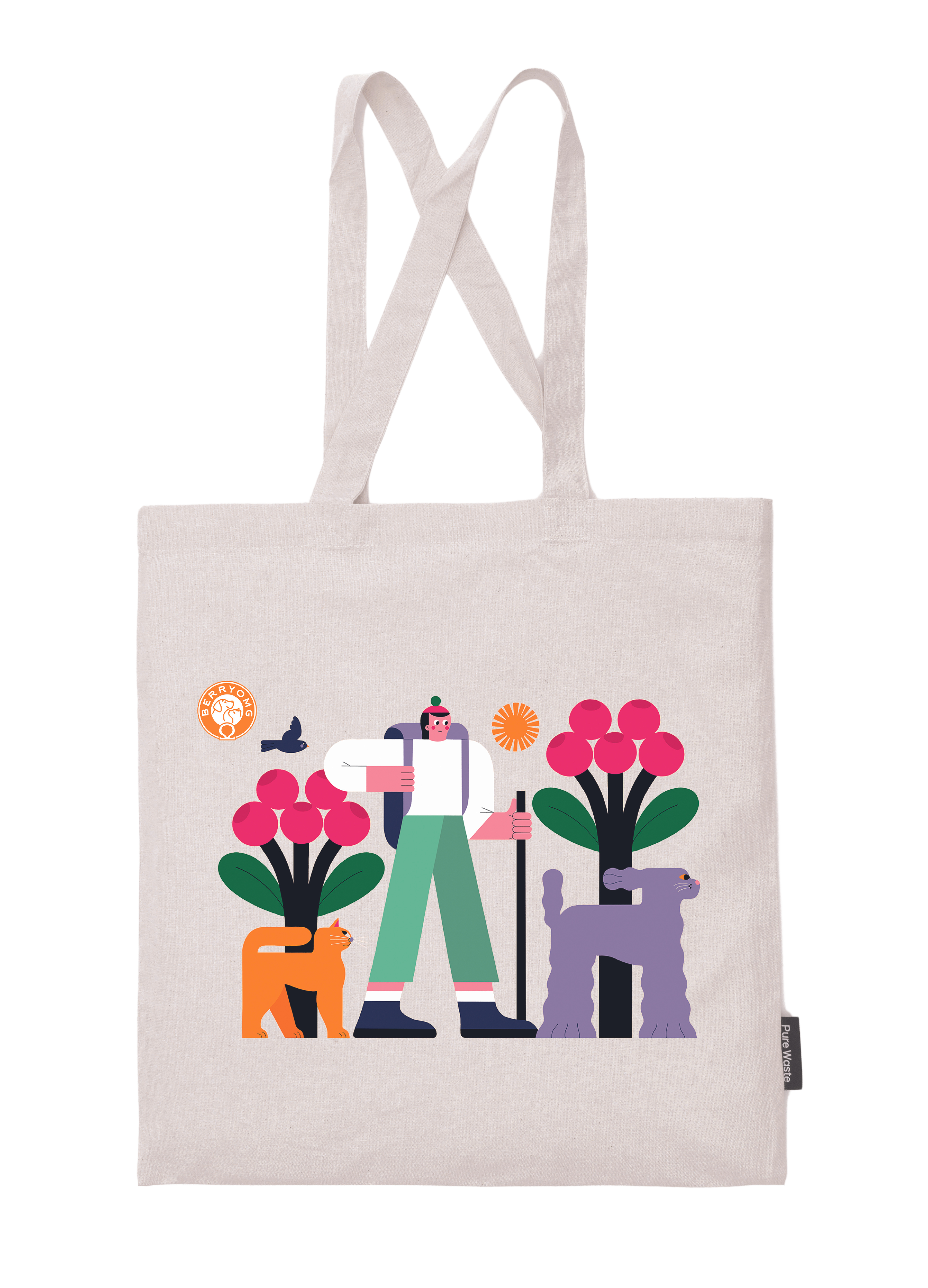 Kierrätysmateriaaleista valmistetun kangaskassin tuotantoon kuluu 99 % vähemmän vettä ja sen valmistaminen tuottaa 50 % vähemmän hiilipäästöjä verrattuna vastavaan neitseellisistä materiaaleista valmistettuun tuotteeseen. Kassin sivusaumassa on Pure Waste kangasmerkki ja edessä upea, kuvittaja Eija Vehviläisen kuvittama painatus.