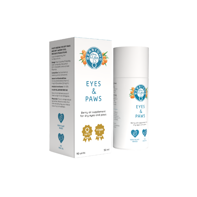 Loistava tuote! Helppo antaa ruoan mukana. Ei sottaa kuten pullosta annosteltava öljy. On auttanut koirieni anturoiden hyvinvoinnissa ja turkkikin kiiltää. Toisella koirallani tulee keväisin ja kesäisin silmäoireita pölystä, mutta nyt eivät silmät ole rähmineet ollenkaan. Suosittelen! ”