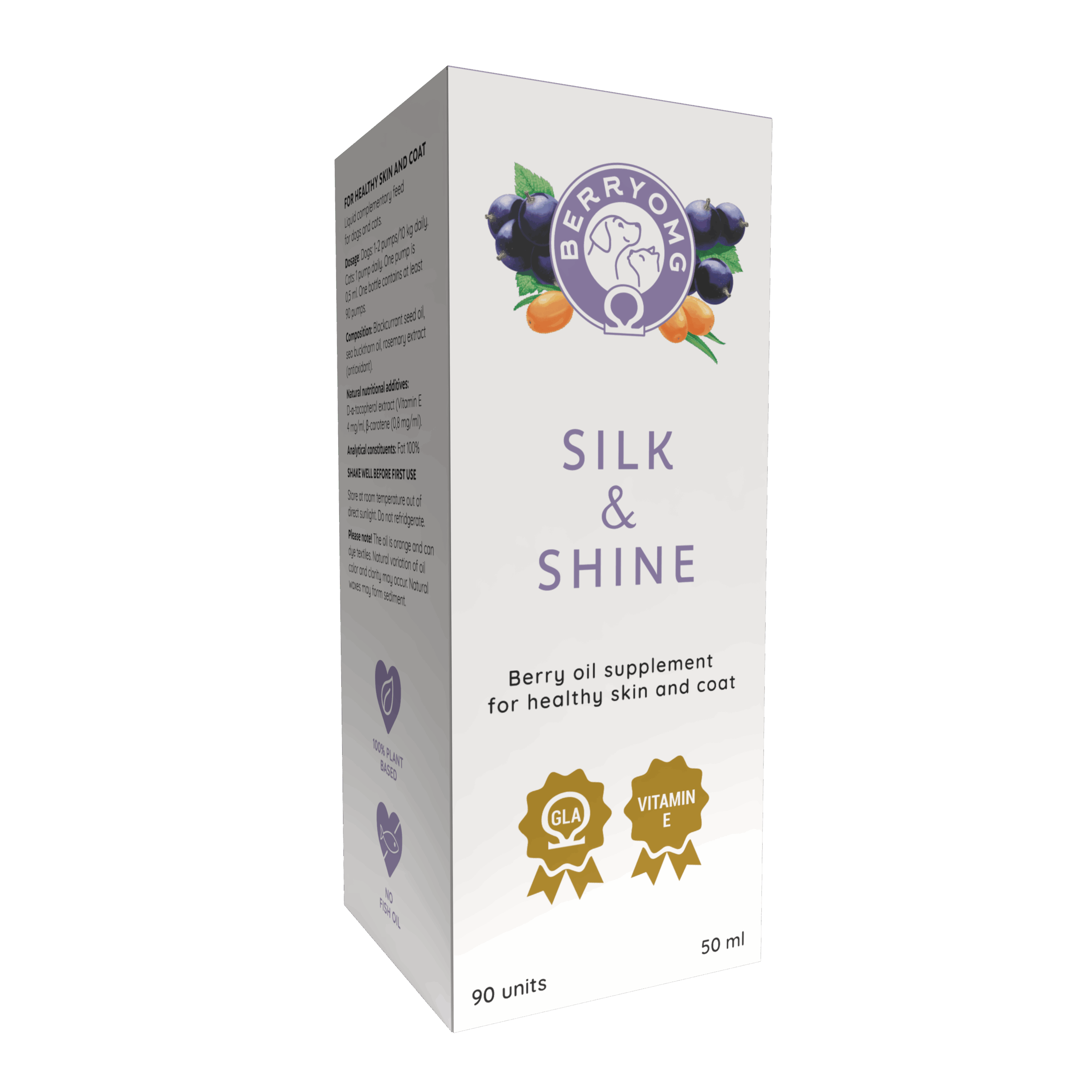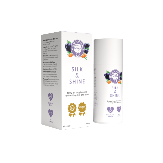 BERRYOMG® Silk & Shine nestemäinen on valmistettu mustaherukan siemenöljystä ja tyrniöljystä. Mustaherukan siemenöljy sisältää omega-6- ja omega-3-rasvahappoja, jotka vahvistavat ihon suojakerrosta ja vähentävät kuivuutta ja kutinaa. Tyrniöljy puolestaan sisältää harvinaisempaa omega-7-rasvahappoa, joka tukee ihon ja limakalvojen hyvinvointia. Tuotteessa on myös ihon hyvinvoinnille tärkeää E-vitamiinia sen luonnollisessa muodossa. Tuotteen rasvahappokoostumuksesta voi olla hyötyä, jos koiran iho-ongelmiin liittyy karvanlähtöä, hilseilyä tai hiivatulehduksia.